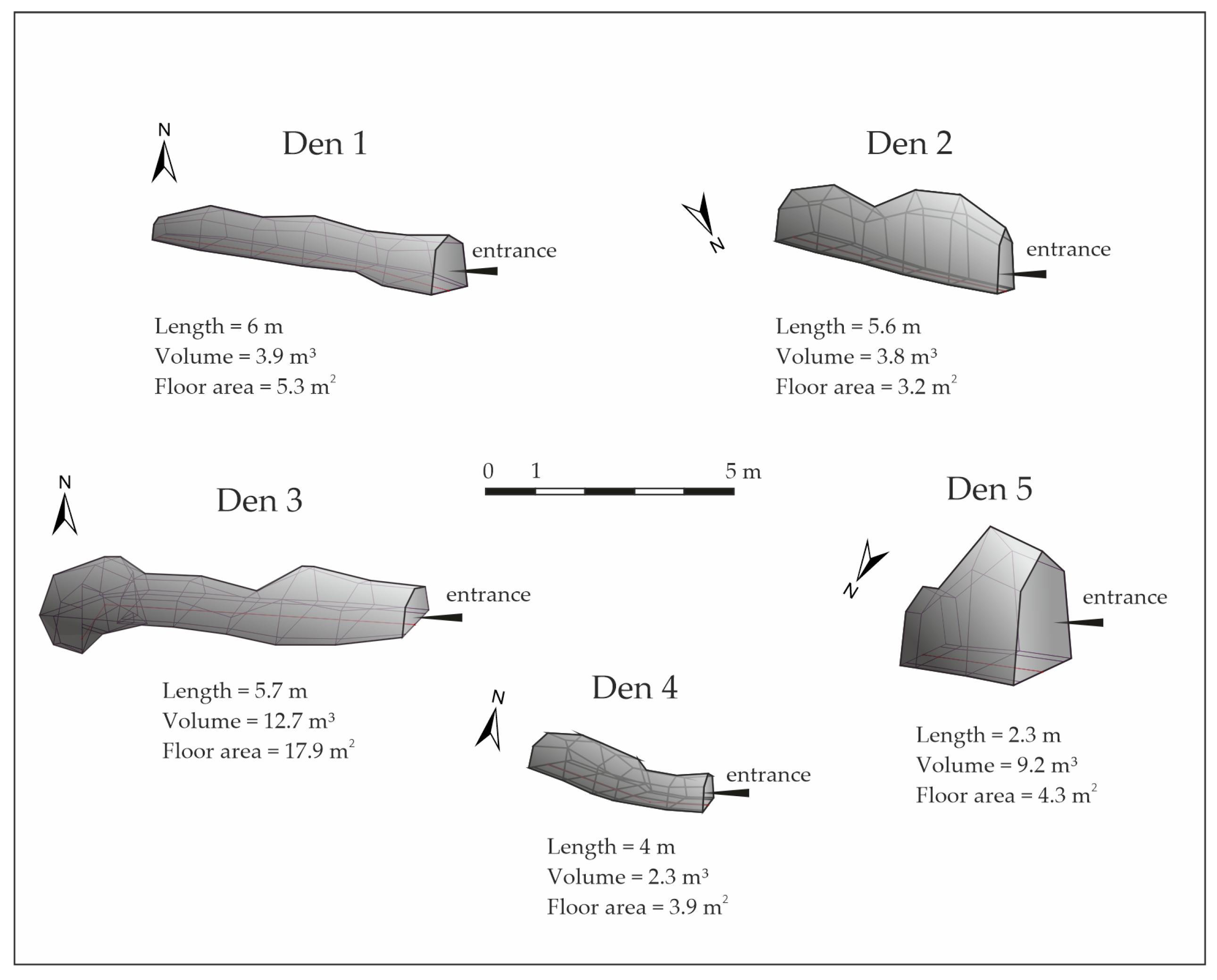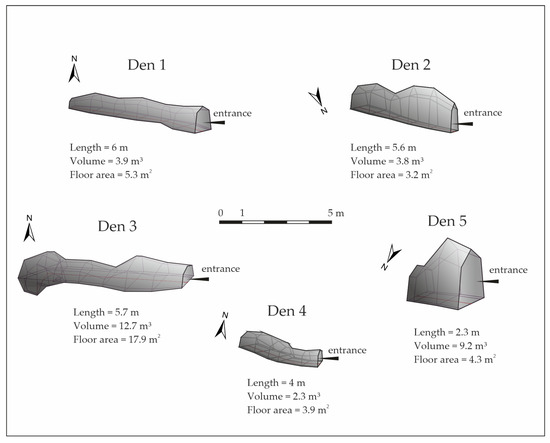 The schematic representations (3D model) of the dens in the study area are shown in Figure 2.