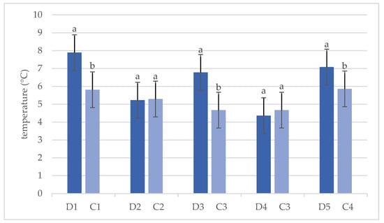 Results of Student’s t-test for the air temperatures (°C) in dens (D) and corresponding forest stands (C). (Bars represent average ± standard deviation. Values marked with a different letter are significantly different at level p < 0.05).