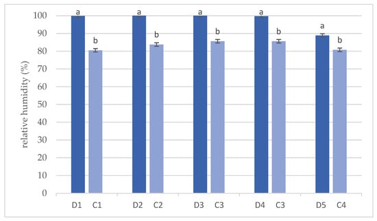 Differences in relative humidity (%) between dens (D) and corresponding forest stands (C). (Values marked with a different letter are significantly different at level p < 0.05).