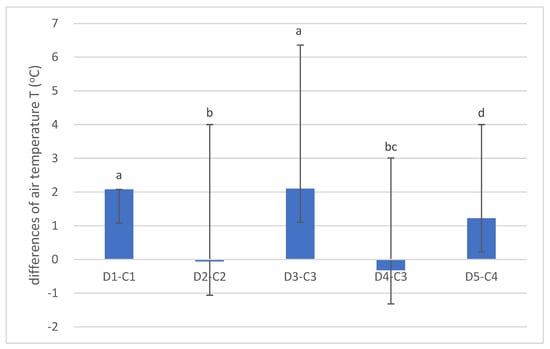 Differences in air temperature (°C) differences between dens (D) and corresponding forest stands (C). (Values marked with a different letter are significantly different at level p < 0.05).