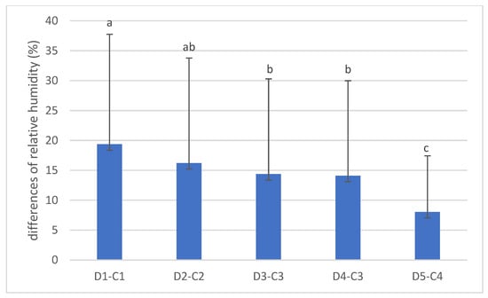 The differences between the average daily relative humidity in the den and the forest stand are shown in Figure 6. There were no differences (p > 0.05) between the relative humidity differences between dens 1 and 2, dens 2 and 3, dens 2 and 4, and dens 3 and 4. The largest difference was 19.37% in den 1 and the corresponding forest stand, and the smallest was 8.05% in den 5. These results can be attributed to the den type, i.e., den 1 is a den with a long tunnel with a chamber and a small air volume, while den 5 is a den with a large opening, a short tunnel and no chamber (rock shelter).