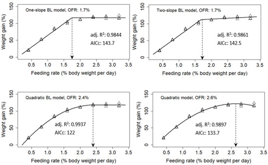 Line/curve fits to the observations obtained from starry flounder (initial body weight: 183.6 ± 2.3 g) fed at various feeding rates (% body weight/day). The fitting was performed using the one-slope straight broken-line (One-slope BL model; (top left)), two-slope straight broken-line (Two-slope BL model; (top right)), quadratic broken-line (Quadratic BL model; (bottom left)), and quadratic (Quadratic model; (bottom right)) models. The triangle symbol indicates the growth response, weight gain (%), responding to the respective feeding rate. The pointing arrow indicates the optimum feeding rate (OFR) estimated by each model. The model selection criteria, including R2adj (adjusted coefficient of correlation) and AICc (corrected Akaike information criterion), were calculated for the selection of best-fit model among the tested models. Larger R2adj and smaller AICc values indicate the better performance of a model.