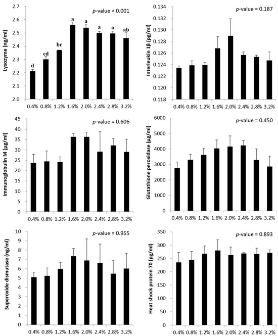 After final weighing and prior to final sampling, feed was withheld from the fish for 24 h. Five additional fish were randomly captured and euthanized with an overdose of 2-phenoxyethanol (200 ppm) to collect blood using a needle, heparinized disposable syringe (3 mL/cc), and vacutainer (BD Vacutainer® Ref #36664; Franklin Lakes, NJ, USA) through caudal vein puncture. The collected blood was centrifuged at 7168× g (VS-24SMTi; VISION Scientific, Co., Ltd., Daejeon, Republic of Korea) for 20 min at 4 °C to separate the plasma. The plasma samples were stored at −80 °C for subsequent analyses of stress and immune response parameters, such as aspartate aminotransferase (AST), alanine aminotransferase (ALT), triglycerides, cholesterol, glucose, total protein, lysozyme, IL-1β, IgM, HSP-70, GSH-PX, and SOD. Plasma metabolites were determined with commercially available kits (ALT, Product Code: 981769; AST, Product Code: 981771; triglycerides, Product Code: 981786; cholesterol, Product Code: 981813; glucose, Product Code: 981780; total proteins, Product Code: 981827; Thermo Fisher Scientific Korea, Ltd., Seoul, Republic of Korea) using blood analyzer (IndikoTM; Thermo Fisher Scientific Korea, Ltd., Seoul, Republic of Korea). Plasma lysozyme, IL-1β, IgM, HSP-70, GSH-PX, and SOD levels were measured using an enzyme-linked immunosorbent assay (ELISA) microplate reader (SYNERGY H1; BioTek Instruments, Inc., Winooski, VT, USA) and commercial kits (Cat. #E17296Fh for lysozyme, E13259Fh for IL-1β, E12045Fh for IgM, E16327Fh for HSP-70, E15930Fh for GSH-PX, and E15929Fh for SOD; CUSABIO, Wuhan, Chian). The assays were performed according to the manufacturer’s protocol.