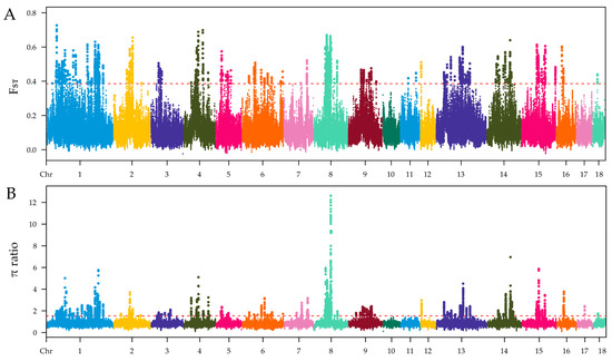 Identification of genomic regions with selection in ZTPs compared to AWBs, which are calculated in a 100 kb sliding window approach with 10 kb step size. (A) Distribution of FST values among autosomal chromosomes. (B) Distribution of π ratio among autosomal chromosomes. The red line represents the threshold value of FST/π ratio.