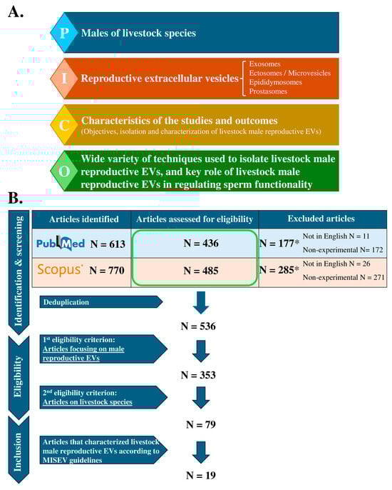 These procedural steps were performed independently by the undersigned reviewers P.M.-D. and M.M., and any discrepancies were resolved by discussion with the undersigned reviewers A.P. and J.R. The set of articles identified in each database was screened to select only those articles reporting experimental results and written in English. Consequently, the search results consisting of reviews, books, book chapters, conference abstracts, letters, commentaries, responses, errata, and editorials were excluded. Articles from the two databases were then combined, and duplicate articles were removed. Two eligibility criteria were used to select eligible articles. The first was that eligible articles should contain the words extracellular vesicles, exosome, microvesicle, epididymosome, or prostasome in the title, abstract, and/or keywords. The terms exosomes and ectosomes (also known as microvesicles) define two types of extracellular vesicles that differ in their biogenesis. Epididymosomes and prostasomes define extracellular vesicles that are secreted in the epididymis and prostate gland, respectively. The second eligibility criterion was that eligible articles should describe studies performed in livestock species. Only articles containing terms related to horses, cattle, small ruminants (sheep and goats), pigs, chickens, or rabbits in the title, abstract, keywords and/or materials and methods section were selected.