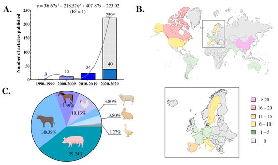 Research on extracellular vesicles in the male reproductive tracts of livestock species: (A) number of articles published per decade and trend, (B) articles published per country, and (C) articles published per species. * Number of articles that would be published by the end of the current decade.
