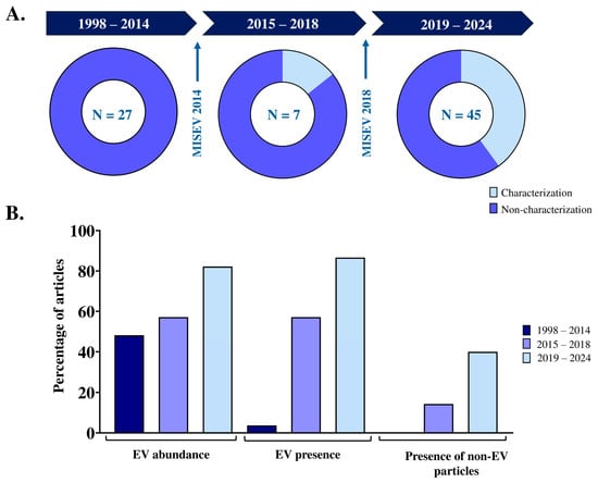 The International Society for Extracellular Vesicles (ISEV), through the Minimal Information for Studies of Extracellular Vesicles (MISEV) guidelines, recommends an orthogonal characterization of EV samples performed by analyzing three main attributes, namely, the abundance of nanoparticles, the identification of EVs, and the presence of non-vesicular extracellular particles (NVEPs) [29]. This recommendation was followed by only 19 of the 79 articles (24.05%). To date, three MISEV guidelines have been published, the first in 2014 [30], the second in 2018 [31], and the third in February 2024 [29]. According to this timing, three time periods were considered to analyze the evolution of the characterization of male reproductive EV samples in livestock, namely, from 1998 to 2014, from 2015 to 2018 and from 2019 to 2024. Only studies that evaluated the three main attributes recommended by MISEV were considered to have performed a satisfactory characterization of the male reproductive EV samples. As a result, none of the 27 articles published between 1998 and 2014 satisfactorily characterized the male reproductive EV samples. One (14.29%) of the 7 articles published between 2015 and 2018 satisfactorily characterized the male reproductive EV samples, and 18 articles of the 45 articles (40%) published between 2019 and 2024 satisfactorily characterized the male reproductive EV samples (Figure 3A). The most and least analyzed attributes of the livestock male reproductive EV samples and how the analysis of each attribute has improved over time are shown in Figure 3B. The least analyzed attribute is the presence of NVEPs.