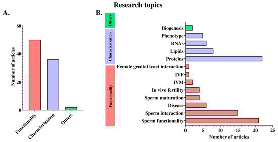Articles were grouped into two main categories according to the research topic addressed, namely, male reproductive EV characterization and male reproductive EV functionality. Articles dealing with research on the phenotypic characteristics of livestock male reproductive EVs (i.e., size, morphology, EV markers, biochemical composition, etc.) were considered to be characterization research articles. Research articles aimed at deciphering the effects of livestock male reproductive EVs on target cells, such as spermatozoa or the functional cells of the female genital tract, as well as their functional effects on other physiological or pathological processes, were considered to be functional research articles. Articles that did not fit into either of the above two categories were included in the “other” category. Thus, 36 articles (45.57%) dealt with characterization topics, and 50 articles (63.29%) with functionality topics. Two articles (2.53%) were included in the “other” category because they dealt with the topic of the biogenesis of male reproductive EVs.