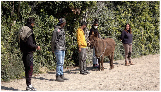 The activities were carried out weekly over a three-month period. The three different locations hosted the activities on a rotating basis so that each of them (and the host animals) was not visited for two weeks consecutively. Each session (both for the EG and the CG) lasted approximately 40 min. For both the EG and the CG, the activities were supervised and modulated by a psychologist (and the animal assistant for the EG) according to the Italian National Guidelines for Animal-Assisted Interventions [23]. Human–animal interactions (EG) were carried out in the animals’ living environment, in a familiar fenced area (Figure 1).