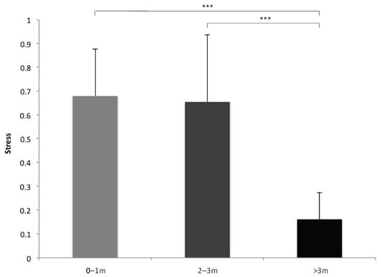 Data of the score of the stress-related behaviour category for each of the distances between the humans and animals considered (means with SEM are shown). ***: p < 0.001.