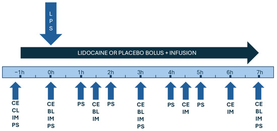 Timeline illustration indicating the treatment periods, the LPS administration time, and the timepoints for clinical examinations (CE), hematological tests (BL), intestinal motility exams (IM), and pain score assessments (PS) in horses subjected to endotoxemia and treated with lidocaine or saline solution infusions.