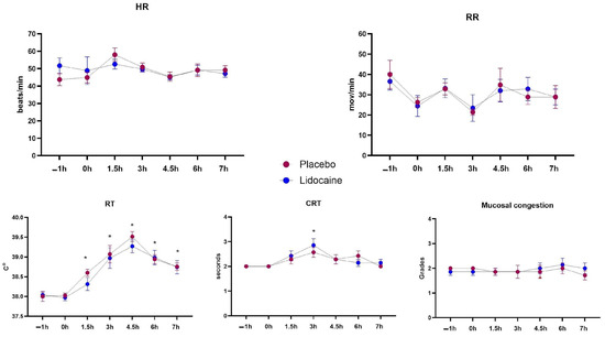 Means and standard errors of heart (HR) and respiratory (RR) rates, rectal temperature (RT), capillary refill time (CRT), and degrees of mucosal congestion in horses subjected to endotoxemia, treated by infusion of lidocaine (blue) or saline solution (red). * Differs from basal values considering both treatments (p < 0.05).