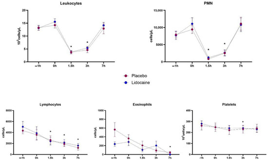 Mean and standard errors of total leukocyte, polymorphonuclear (PMN), lymphocytes, monocytes, eosinophils, and platelet counts in horses subjected to endotoxemia, treated by infusion of lidocaine (blue) or saline solution (red). * Differs from basal values considering both treatments (p < 0.05).