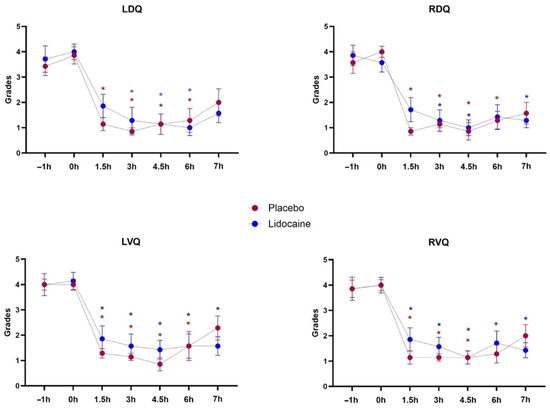 Mean and standard errors of the left dorsal (LDQ), right dorsal (RDQ), left ventral (LVQ), and right ventral (RVQ) abdominal quadrants borborygmus intensity grades in horses subjected to endotoxemia, treated by infusion of lidocaine (blue) or saline solution (red). * Differs from basal values considering each treatment (p < 0.05).