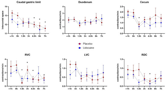 Mean and standard errors of the intercostal space of the caudal gastric edge, and the counts of contractions of the duodenum, cecum, the left ventral (LVC), right ventral (RVC), and right dorsal (RDC) colons of horses subjected to endotoxemia, treated by infusion of lidocaine (blue) or saline solution (red). * Differs from basal values considering both treatments (p < 0.05).