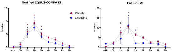 Means and standard errors of the degrees of pain intensity obtained by the EQUUS-FAP or modified EQUUS-COMPASS scores systems in horses subjected to endotoxemia, treated with lidocaine infusion (blue) or saline solution (red). * Differs from baseline in the same group (p < 0.05). # Differs from the other treatment at the same timepoint.