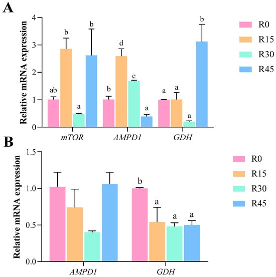 The hepatic mRNA expression level of AMPD1 initially increased and then declined with increasing dietary RSC inclusion, and this was significantly higher in the R15 and R30 groups compared to the R0 group (p < 0.05; Figure 1). In contrast, the hepatic mRNA expression level of mTOR first declined and then increased with raising dietary RSC inclusion, and this was significantly lower in the R30 group compared to the R15 and R45 groups (p < 0.05). The hepatic mRNA expression level of GDH was significantly higher in the R45 group compared to the other groups (p < 0.05). However, the hepatic mRNA level of IGF-1 was unaffected by the dietary inclusion of RSC (p > 0.05). Similarly, the muscular mRNA level of AMPD1 remained unaffected by dietary RSC inclusion (p > 0.05). The muscular mRNA level of GDH declined with increasing dietary RSC inclusion, and this was significantly lower in the R15, R30, and R45 groups compared to the R0 groups (p < 0.05).