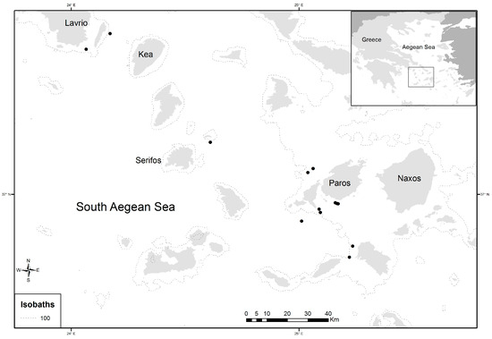 Map of study area and location of sampling sites (dots in black) of Dentex maroccanus in the South Aegean Sea.