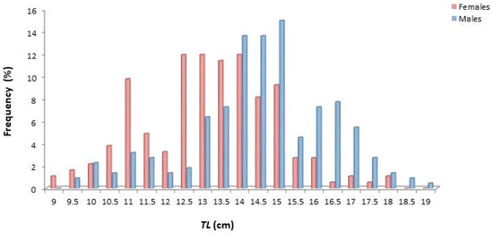 The size of females varied from 9.2 to 18.1 cm TL, while that of males from 9.6 to 19.2 cm (Figure 3). Males showed dominance towards greater sizes, while females were generally smaller in size.