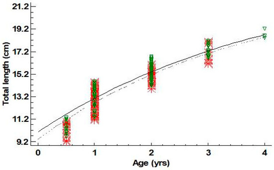 Von Bertalanffy growth curves fitted for females (- -*- -) and males (─∇─) of Dentex maroccanus in the South Aegean Sea (red asterisks: female observations—green triangles: male observations).