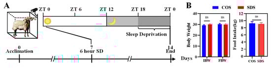 We selected 60 male Tibetan (Ovis aries) lambs (6-month-old sheep, initial body weight 23.1 ± 0.5 kg) and raised them in the sheep house of the Hangzhou Animal Husbandry Co., Ltd., Hangzhou, China. All Tibetan sheep were housed in separate cages (five per cage) and had ad libitum access to water. The sheep were fed twice daily, at 7 am and 5 pm. The residual feed was weighed, and the cages were cleaned daily. The average daily feed intake was recorded. The feed was free of antibiotics and met the standard nutritional needs of growing Tibetan sheep (Table S1). The sheep were acclimatized to the environment for 1 week before the trial began. All sheep were kept under 12 h light/dark conditions (ZT: zeitgeber time; ZT0 represents sunrise at 6 am). Sheep were randomly divided into a normal-sleep control group (COS, n = 30) and an SD model group (SDS, n = 30). The COS group had no sleep interventions, whereas the SDS group was sleep-deprived from ZT18 to ZT0 (Figure 1A). After 1 week of SD, liver and serum samples were collected every 4 h over a 24 h cycle (n = 4). Both groups were raised under identical temperature and humidity conditions (Figure S1). There were no significant differences in the daily feed intake or body weight changes between the two groups before and after the trial (Figure 1B).