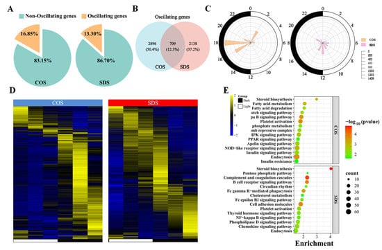Sleep deprivation caused a change in the circadian rhythm of the genes expressed in the liver of Tibetan sheep. (A) Pie chart diagram showing the percentage of oscillating and non-oscillating genes in the COS and SDS groups (ADJ.P < 0.05). (B) Venn diagram displaying the number (top) and ratio (bottom) of oscillating genes in liver samples isolated from Tibetan sheep in the COS and SDS groups (ADJ.P < 0.05). (C) The polar plot represents time when the genes’ peak level of abundance appeared; yellow (COS group) or pink (SDS group) shading represents the number of rhythmic genes with an estimated peak value for each time as determined by JTK analysis. The radius of black concentric circles indicates the number of rhythmic genes, and the minimum radius of the black concentric circle represents 200 genes. The black arc on the left side of the polar plot indicates the day/night cycle. (D) Heat map showing oscillating genes in the COS (left) or SD (right) groups (ADJ.P < 0.05). (E) KEGG-enriched pathways for the expression of COS group oscillating genes and SDS group oscillating genes (p < 0.05).