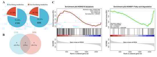 JTK analysis of these DEGs revealed that 21.70% and 20.75% of the DEGs in the COS and SDS groups, respectively, exhibited circadian rhythms (Figure 4A), with four DEGs exhibiting circadian rhythms in both groups (Figure 4B). GSEA of lipid metabolism and apoptosis genes revealed that gene sets related to lipid metabolism were generally expressed at high levels in the COS group than that in the SDS group. Simultaneously, the expression of the genes involved in apoptosis was higher in the SDS group than that in the COS group (Figure 4C), suggesting that SDS may alter the circadian rhythm of gene expression in sheep livers by affecting lipid metabolism.