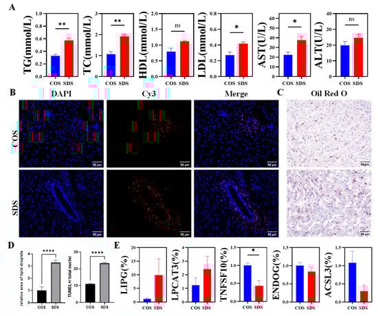 Sleep deprivation impacts lipid metabolism and induces hepatic injury. (A) Serum TG, TC, HDL, LDL, AST, and ALT levels. (B) TUNEL assay of liver tissue cells. Nuclei stained by Merge. Positive apoptotic cells are red. Blue is the nucleus. Scale bars, 50 μm. Magnification: ×40. (C) Representative images of liver sections stained with Oil red O. Scale bars, 50 μm. Magnification: ×40. (D) Quantitative data for the percentage of TUNEL-positive cells and the positive area of the Oil red O staining in the COS and SDS groups. (E). mRNA expression of LIPG, TNFSF10, LPCAT3, ENDOG, and ACSLE in the liver. All data are shown as the mean ± SEM. * p < 0.05, ** p < 0.01, **** p < 0.0001.
