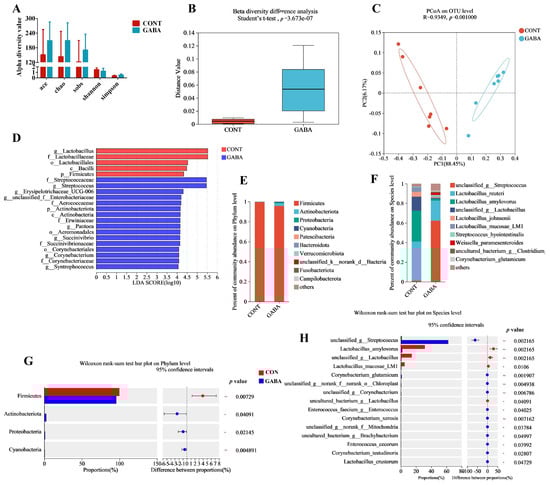 GABA supplementation-reshaped bacterial community in weanling piglets. (A) Alpha diversity. (B) Beta diversity. (C) PCoA on the operational taxonomic unit level. (D) LDA value distribution. Relative abundance of bacteria classified at phylum (E) and species (F) level. Different bacteria classified between groups at phylum (G) and species (H) level. CONT, pigs fed a basal diet. GABA, pigs fed a basal diet with 80 mg/kg of GABA supplementation. * p < 0.05, ** p < 0.01.