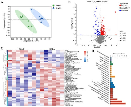 GABA supplementation-modulated intestine nutrient metabolism in weanling piglets. (A) PLS-DA score plot. (B) Volcano plot analysis of differential metabolites. (C) Heatmap showing the changes in metabolites. (D) KEGG statistical maps of differential metabolites.