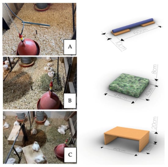 - Riber, A.B.; van de Weerd, H.A.; de Jong, I.C.; Steenfeldt, S. Environmental Enrichment for Broiler Chickens: A Review. Poult. Sci. 2018, 97, 378–396. [Google Scholar] [CrossRef]