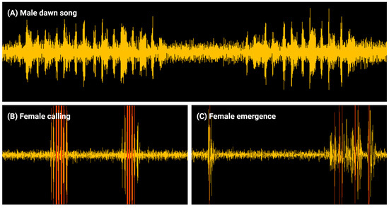 Sound waves of male dawn song, female calling and female emergence. Sound waves of the SongMeter recordings could be visualised using Avisoft-SASLab Pro (version 5.2.15) [63]. Typical patterns for male dawn song (A), female calling (B) and female emergence (C) are shown and were used to determine the onset of activity.