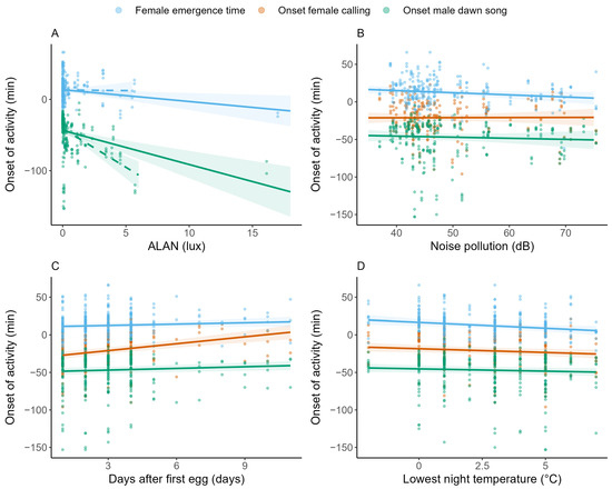 Effect of predictors on the onset of activity. For each proxy for the onset of activity (indicated by the different colours), a predicted regression slope (line) with 95% CI (shaded area) for the models with a robust fit is shown for ALAN (A), noise pollution (B), the number of days after the first egg (C) and the lowest night temperature (D), while controlling for other predictors. The slope for ALAN for the onset of female calling is not illustrated because there was a significant interaction effect with noise pollution (see Figure 3). The slopes for ALAN for robust models with an alternative dataset are shown as well ((A); indicated with dashed lines). Raw data are plotted in the figures, and standardised predictors are back-transformed for interpretability.