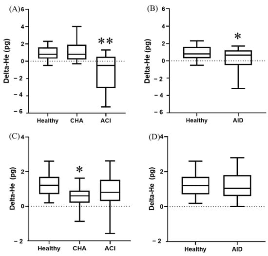 3.3. Delta-He in Dogs and Cats with AID, CHA, and ACI
