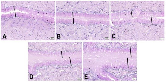 Photomicrographs of the epithelium of the magnum of 64-week-old laying hens fed different levels of FTU in the diets. (A) 0 FTU; (B) 500 FTU; (C) 1000 FTU; (D) 1500 FTU; (E) 3000 FTU. The black bars show the thickness of the epithelium of the magnum in the different treatments. Periodic acid–Schiff staining.
