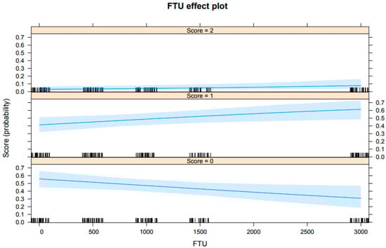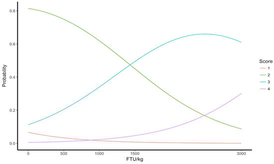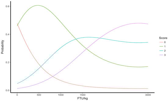 In relation to the hepatic steatosis score variable, an inverse correlation was observed between the occurrence of a steatosis score of 0 (indicating no presence of steatosis) and the levels of FTU in the diet. Specifically, as the levels of phytase increased, the birds exhibited an emergence of cytoplasmic lipid vacuoles in their hepatocytes. Furthermore, it was found that a higher probability of the occurrence of grade 1 steatosis, characterized by mild steatosis, was associated with higher FTU levels. Notably, no instances of advanced steatosis (score 3) were reported for the animals (refer to Figure 2).