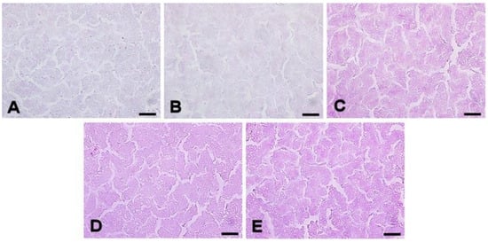 Photomicrographs of the liver of 64-week-old laying hens fed different levels of FTU in the diets. (A) 0 FTU; (B) 500 FTU; (C) 1000 FTU; (D) 1500 FTU; (E) 3000 FTU. Periodic acid–Schiff staining.