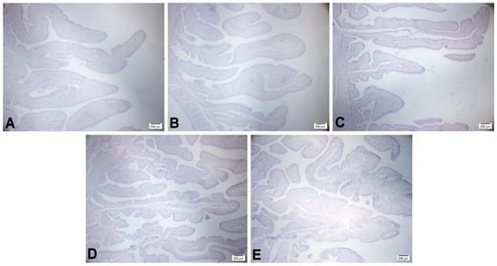 The analysis of the photomicrographs of the uterus of the laying hens (Figure 6) provided further clarification for the results obtained in the statistical analysis conducted on the scores of the uterine folds. Image “A” (T1—0 FTU) clearly illustrates the number of folds present in the uterus of these animals. Moreover, there is a noticeable increase in the number of folds as depicted in image “B” (T2—500 FTU) and image “C” (T3—1000 FTU). Images “D” (T4—1500 FTU) and “E” (T5—3000 FTU) correspond to scores of 3 and 4, respectively, indicating a higher number of uterine folds.