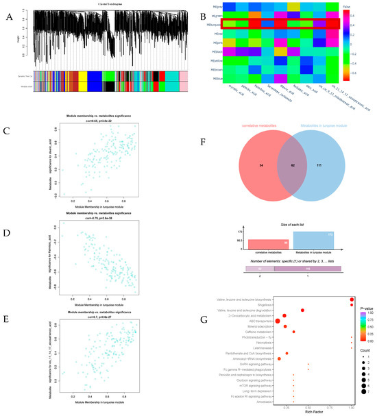 Correlation between metabolites in goat rumen contents and fatty acids in meat. (A) Cluster map of the rumen contents of Hechuan white goat metabolome modules. (B) Module–fatty acid trait correlation diagram; each row represents a module, and each column represents a fatty acid trait. (C) Scatter plot of the significance (MS) of the metabolites in the module membership (MM) versus stearic acid in the turquoise module. (D) Scatter plot of palmitoleic acid versus the significance (MS) of metabolites in the module membership (MM) in the turquoise module. (E) Scatter plot of DH-γ-linolenic acid versus the significance (MS) of metabolites in module membership (MM) in the turquoise module. (F) Venn plot of metabolites significantly associated with the metabolite set in the turquoise module. (G) Bubble plot of KEGG pathway enrichment analysis for metabolites of interest.