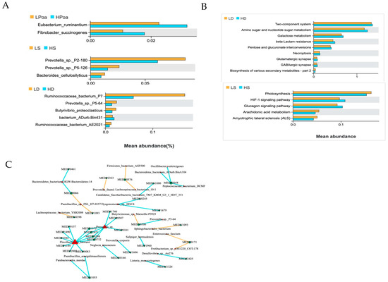 (A) Bacterial species exhibiting significant differences between groups and with an abundance greater than 1% (p < 0.05); (B) KEGG annotation pathway with significant differences between groups; (C) network of correlation analysis between microbial species abundance and key metabolites. Lpoa: low palmitoic acid group; Hpoa: high palmitoic acid group; LS: low stearic acid group; HS: high stearic acid group; LD: high Dh-γ-linolenic acid; HD: high Dh-γ-linolenic acid group.