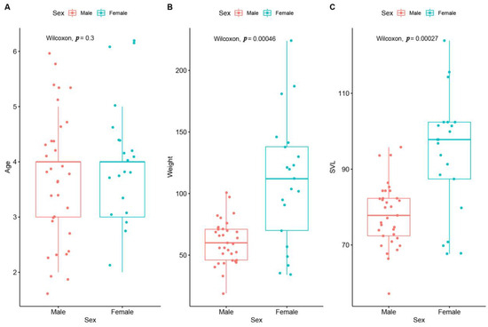 Differences between sexes are illustrated by boxplots. Points represent scattering of each individual (A: age; B: weight; and C: SVL).