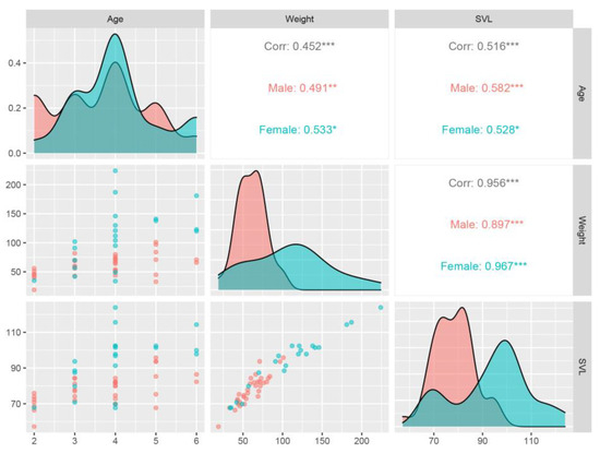 Pearson’s product-moment test indicated that statistically significant positive correlations existed between the following variables (Figure 4). The constructed regression models also validated the linear relationship between age and SVL (males: F = 15.91; R2 = 0.31; p < 0.05; females: F = 7.35; R2 = 0.24; p < 0.05), age and weight (males: F = 9.82; R2 = 0.21; p < 0.05; females: F = 7.52; R2 = 0.24; p < 0.05), and weight and SVL (males: F = 127.30; R2 = 0.79; p < 0.05; females: F = 270.30; R2 = 0.93; p < 0.05).