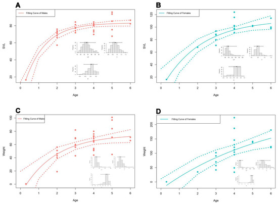 The constructed Von Bertalanffy’s growth curve models for age and SVL as well as age and weight (A: SVL model for males; B: SVL model for females; C: weight model for males; and D: weight model for females).