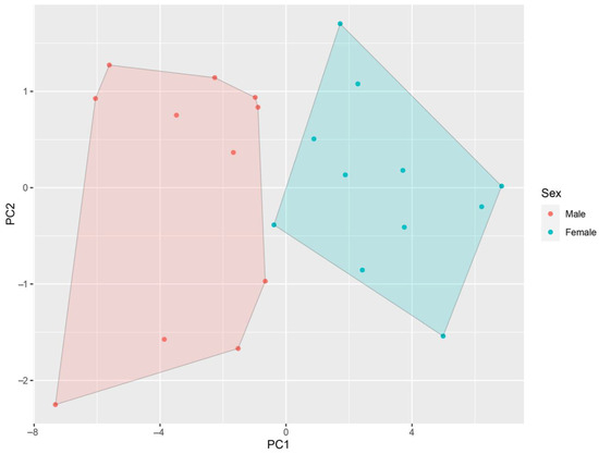 Student t-test results showed significant differences between terms of L. c. (t = 4.40; p < 0.001; male-biased), 0.61S. p. n. (t = 3.52; p < 0.001; male-biased), L. o. (t = 3.14; p < 0.001; male-biased), Lt. c. tym (t = 2.35; p < 0.05; male-biased), M (t = 4.33; p < 0.001; male-biased), F (t = 5.51; p < 0.001; male-biased), and At. c. int. (t = 2.17; p < 0.05; male-biased). Sexual shape dimorphism was observed only in M (F = 5.43; p < 0.05). Accordingly, males had larger forelimbs compared to females. SVL-independent PCA results showed that individuals from both sexes separated along PC1 (Figure 6). Three principal components were extracted, taking eigenvalues > 1 as a reference. The first principal component (PC1) explained 68.81% of the total variance. In total, 79.32% of variance was cumulatively explained by three components. PC loadings are noted in Table 3.