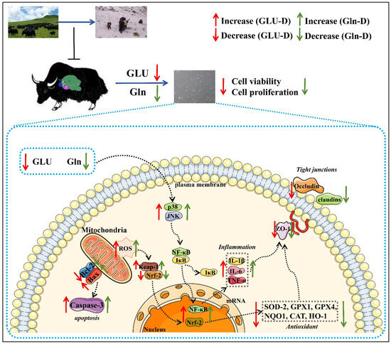 Yue Z, Wang J, Hu R, Peng Q, Guo H, Zou H, Xiao J, Jiang Y, Wang Z. Effects of Glutamine or Glucose Deprivation on Inflammation and Tight Junction Disruption in Yak Rumen Epithelial Cells. Animals. 2024; 14(22):3232. https://doi.org/10.3390/ani14223232