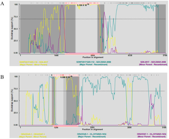 Potential recombination events detected in our PPV2 and PPV3 strains by RDP4. (A) The PPV2 GDCZ2023-2088 strain was recombined from the major parental virus SDWF20171225-112 and the minor parental virus GD6-2017. (B) The PPV3 HLJSYS2023-1654 strain was recombined from parental GD202206-4 and SD202203-3 viruses. The p value identified by the BootScan method for each cross-over event was also shown.