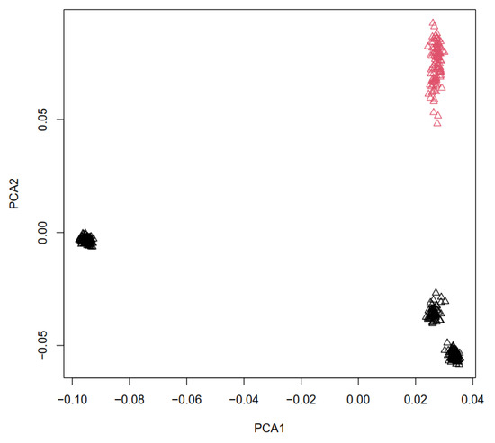 To identify existing population structures, we conducted a population stratification analysis using Principal Component Analysis (PCA). This analysis was performed to determine how the animals were allocated to their groups based on all markers that passed quality control, and to understand the genetic structure of the studied populations. PCA was performed using the prcomp function in R version 4.2.3 package (http://cran.r-project.org, accessed on 16 March 2023).