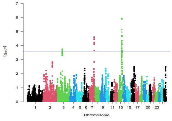 The hapFLK statistic was implemented to find genomic regions under selection. As shown in Figure 3, the distribution of hapFLK values approximately follows the normal distribution. p-values for hapFLK calculated using an empirical method is appropriate because of ascertainment bias in the SNP panel [5]. Therefore, the p-value of each SNP was obtained from a normal distribution. Negative log10 p-values plotted in genomic order revealed three regions under strong selection. The hapFLK analyses detected regions of putative selection signature regions, notably with strong signals at chromosomes 3 (47,927–48,527 kb), 7 (74,411–75,011 kb), and 13 (77,582–78,182 kb) (Figure 3 and Table 1). Only the genomic region in chromosome 3 was detected by both FST and hapFLK methods.