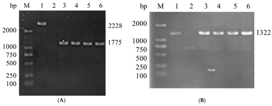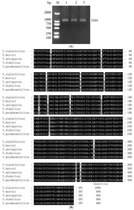 Primers were designed according to the V. alginolyticus gene sequence (GenBank Number: KX245316). PCR was carried out in a Thermocycler (Bio-Rad, Hercules, CA, USA) with the following ideal amplification conditions: 30 cycles of 95 °C for 30 s, 55 °C for 45 s, and 72 °C for 90 s after an initial denaturation at 95 °C for 5 min. The amplification product (5 μL) was examined on 1% agarose gels, stained with ethidium bromide. Additionally, the PCR products were converted into E. coli DH5α by ligating them to the pMD18-T vector (Table 1). DNA sequencing was performed by Sangon Biological Engineering Technology & Services Co., Ltd. (Shanghai, China). Similarity analyses of the nucleotide sequences and deduced amino acid sequences were performed according to the method of Zhou [18]. Additionally, ExPASy tools were used to analyze protein sequences (http://expasy.org/tools/), accessed on 21 May 2020.