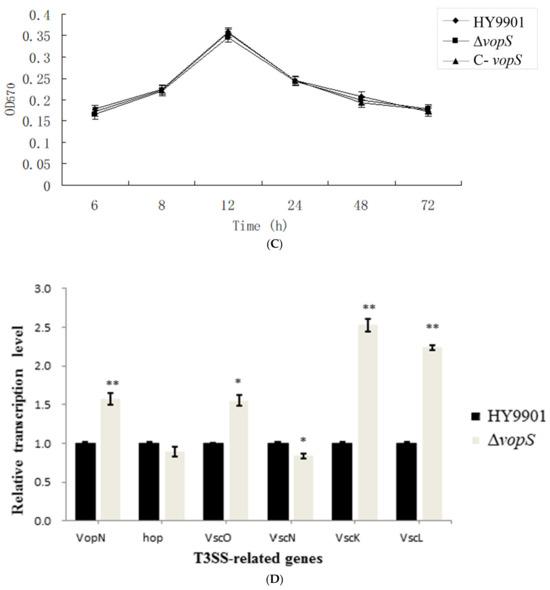 VopS is an essential component of T3SS. To analyze the role of VopS in T3SS in depth, qRT-PCR was performed on the ΔvopS. Some T3SS-related genes were detected, including vsck, vscL, vscN, vopN, vscO, and hop. The vscO is a chaperone escort protein. The vscN, hop, and vopN are effector or regulatory, and vscL and vscK are apparatus proteins. The results showed that compared with HY9901, ΔvopS decreased the expression of hop and vscN and significantly increased the expression of vscL, vscK, vopN, and vscO (Figure 3D).
